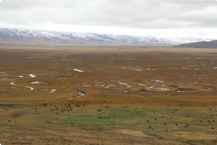 新华社兰州11月23日电(记者张百慧、张玉洁)甘肃省甘南藏族自治州玛曲县阿万仓镇的两百多万亩草原上,“几”字形河流连绵不断,黑色牦牛星星点点,构成一幅生动的高原风物图鉴。