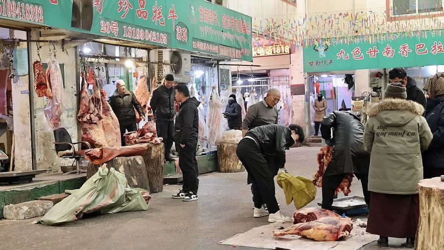 集散中心门口醒目摆放的价格表清晰标注着各类牛羊肉售价,市场内,一排排色泽鲜亮的牦牛肉、藏羊肉整齐悬挂,红白相间的牛羊肉在灯光下泛着自然光泽,吸引广大采购商与消费者驻足挑选,询价声、称重声、笑语声交织成冬日草原上最鲜活的交响。